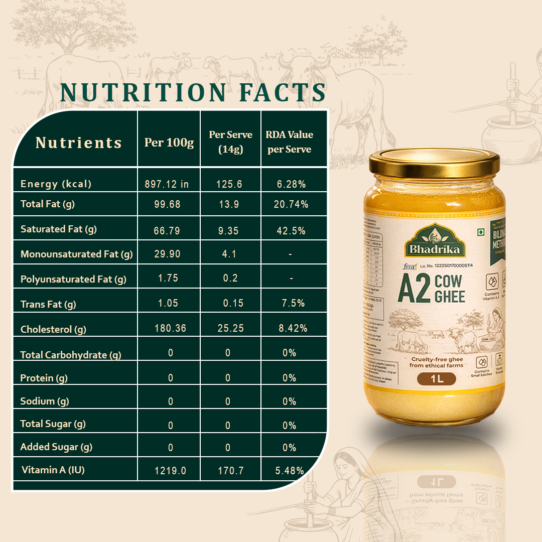 Bhadrika Ghee is crafted exclusively from A2 milk sourced from indigenous Indian cow breeds and prepared using the traditional bilona method. This preserves its natural properties, aroma, and digestibility—unlike mass-produced ghee made from mixed milk or industrial processes.